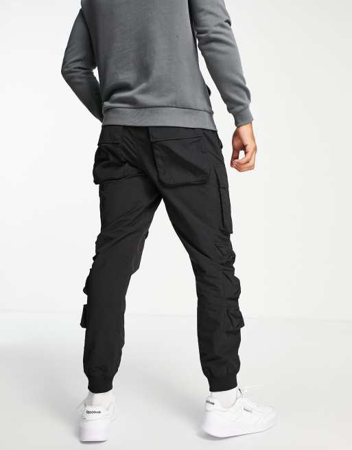 Topman Relaxed Nylon Multi Pocket Cargo Pants In Black Asos